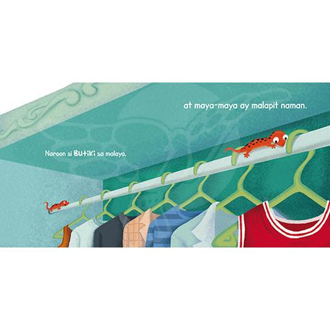 This Filipino (Tagalog) picture book tells the story of a cute little lizard's (butiki) adventure around the house. Through the butiki's escapades, children are introduced to words that describe opposite meanings and relative positions, such as "on/under," "left/right," and "up/down." Through colorful illustrations, this book provides an opportunity for children to learn and enrich their vocabulary in a fun and engaging way.